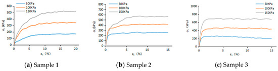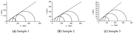 Since the influence of groundwater was not considered in the actual project, unconsolidated and undrained triaxial tests were conducted to measure the mechanical parameters of similar materials. The stress–strain curves of the three samples subjected to confining stress of 50, 100, and 150 kPa are shown in Figure 8. By employing a nonlinear programming approach, the cohesion values (c) were determined as 0.8 kPa, 28 kPa, and 8 kPa for samples 1, 2, and 3, correspondingly, while the internal friction angles (ϕ) were calculated as 33.5°, 31°, and 38.5° for samples 1, 2, and 3. The corresponding Mohr–Coulomb envelopes are shown in Figure 9.
