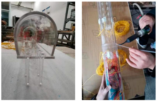 In this experiment, plexiglass was used to make the tunnel–pile structure. Flexural stiffness was adopted as the governing criterion for determining the thickness of the tunnel lining and the diameter of the tunnel pile. According to the principle of similarity ratio, the ratio between the flexural stiffness K of the actual tunnel lining and the flexural stiffness K0 of the model test is (1/80)5. Calculations revealed a tunnel lining thickness h0 of 4 mm and a pile diameter D0 of 6.2 mm. The completed model is shown in Figure 11.