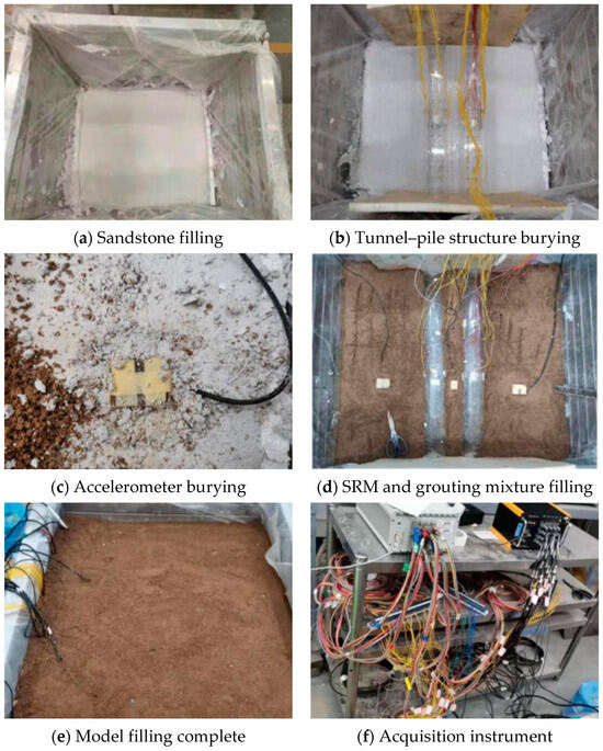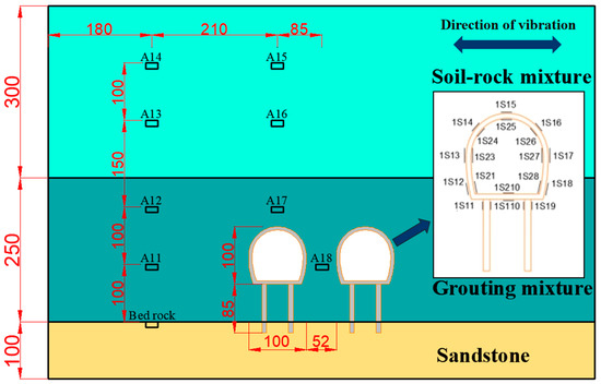 In order to study the acceleration response characteristic of surrounding rock and tunnel–pile structure system, accelerometers and strain gauges were used in this experiment. The sensor layout of the model test is shown in Figure 12.