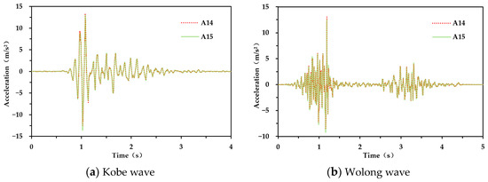 After the model filling was completed, the boundary effect of the model was verified first. Kobe wave and Wolong wave with 1.2 g peak acceleration were the input. A comparison of acceleration–time history curves of measuring points A14 and A15 under the action of Kobe wave and Wolong wave is shown in Figure 14. The height of the curves was almost consistent, indicating that the boundary effect produced by the layered shear box in this test was small.