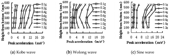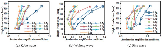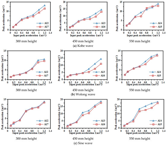 As illustrated in Figure 12, five measuring points were arranged along the stratum height, sequentially identified from bottom to top as bedrock, A11, A12, A13, and A14. Figure 15 shows the curves of peak acceleration variation along the height of the stratum under different seismic waves. It can be seen that the peak acceleration within the stratum exhibited a consistent rise with increasing height from the base, distinctly displaying an amplification effect.