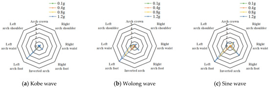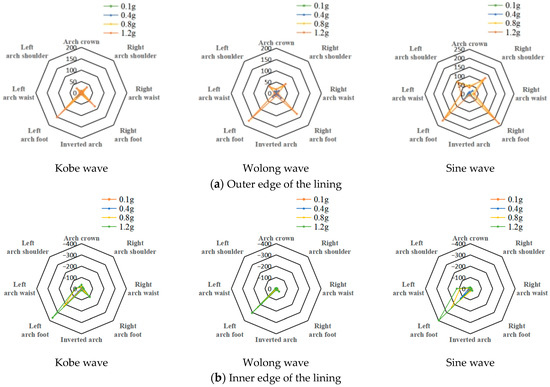 The strain radar diagram of the tunnel lining under the action of Kobe wave, Wolong wave, and sine wave at different peak accelerations is shown in Figure 18. Analysis of the strain radar diagram reveals distinct patterns: On the outer edge of the lining, the highest strain peak occurs at the arch foot, followed by the arch shoulder, with comparatively lower values observed at the arch crown, arch waist, and inverted arch. The distribution of strain response peak value of the tunnel lining cross-section exhibited an “X” shape. On the inner edge of the lining, the peak value of strain at the left arch foot of the left tunnel lining was significantly greater than that at the right arch foot, indicating that the strain dynamic response of the inner edge of the lining was less pronounced than that of the outer edge due to the interaction of the two tunnels.