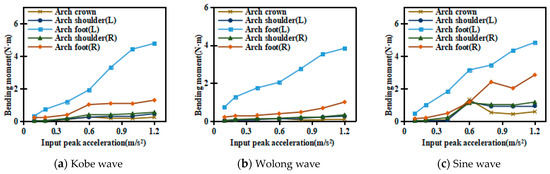 It can be seen from Figure 20 that with the increase in the input peak acceleration, the bending moment value at each position of the lining generally keeps increasing. When the input peak acceleration remained below 0.6 g, the bending moments of the lining retained a consistent increase trend except at the arch foot. As the input peak acceleration exceeds 0.6 g, the increase rate of bending moment slowed down at almost each position. As the input peak acceleration exceeds 0.8 g, the bending moment value of all lining positions did not increase except in the left arch foot.