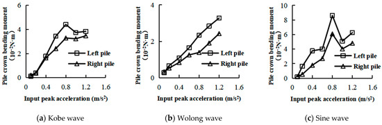 Based on the strain data on the left and right sides of the pile crown, the bending moment changes of the pile crown under different seismic waves were plotted, as shown in Figure 21. Under the action of the three seismic waves, the bending moment of the left pile crown was greater than that of the right pile crown. Under the action of Kobe wave and sine wave, when the peak acceleration of input seismic wave was between 0.1–0.8 g, the bending moment of the pile crown increased gradually. As the peak acceleration of the input seismic wave exceeded 0.8 g, the bending moment of the pile crown approached stability or began to decline. The reason is that when the input peak acceleration exceeded 0.8 g, the grouting stratum besides pile entered large plastic deformation state; the peak dynamic earth pressure tended to be stable, so the dynamic bending moment also tended to be stable. When subjected to Kobe and sine waves, the decrease in the bending moment at the pile crown can be attributed to the energy dissipation after the grouting stratum reached the critical threshold of plastic deformation, causing a sudden decrease in dynamic earth pressure from the maximum value.
