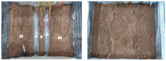 After the shaking-table test was completed, the surface settlement was observed and measured. As shown in Figure 22 and Figure 23, there was no significant settlement of the stratum above the tunnel. However, the free field stratum on both sides had obvious settlement. By measurement, the settlement amount on the left side reached 1 cm, and the right side reached 1.5 cm, indicating that the surface settlement of the soil–rock mixture was obvious under the action of the earthquake. However, the existence of a tunnel–pile structure mitigated the surface settlement obviously, and the uneven surface settlement would cause the cracking and destruction of above-ground roads and structures in practical engineering.