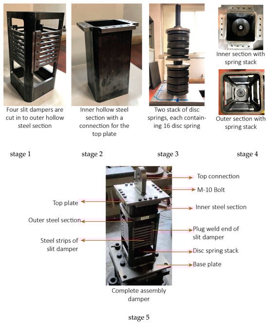 The components and assembly progression of the SC-DSD are depicted in Figure 1. Four steel slit dampers, specifically designed for the prototype, are incised on each facet of the boxed-shaped hollow structural section. The open end (moving end) of each slit dampers are welded to the interior boxed-shaped steel section. Two stacks of disc springs, pre-tensioned and situated within both the outer and inner sections, are also depicted in stage 3. The assembly of the damper is finalized by connecting the top plate to the inner steel section using M-10 high-strength bolts. Figure 2 provides an overview of the dimensions of the slit damper and disc spring components. The distinctive attributes of the material utilized for the slit damper and springs are enumerated in Table 1.