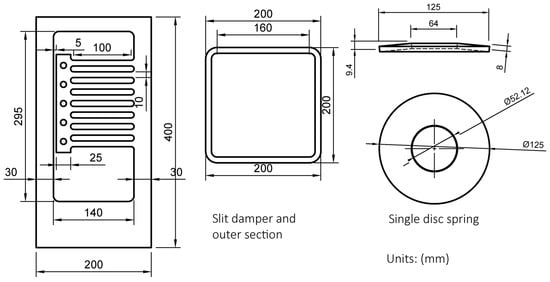 where Ks is the elastic stiffness of the four slit dampers; n is the number of steel strips; b and t are the width and thickness; l is the length of the steel strips; Fy is the yield strength of the slit dampers; Fr is the restoring force provided by the disc springs. Further details about the above design equations can be found elsewhere [,].