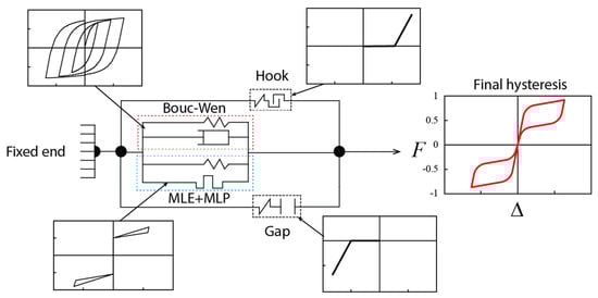 The analytical macro model is shown in Figure 3. There are three nonlinear links combined to form the model in the structural analysis software known as “Perform 3D V 8.0”. These links represent the behavior of the slit damper using the Bouc–Wen model [], consisting of a dashpot combined with spring. At the same time, the multi-linear elastic (MLE) and multi-linear plastic (MLP) are combined to produce the behavior of the prestressed disc springs. These links are built into most of the structural analysis software for practicing engineers. Figure 3 also depicts the behavior of each link to achieve the recentering hysteresis loop. Gap and hook links are used to control the maximum stroke displacement of the damper under tensile and compressive forces. The simplification of the analytical model is useful in providing the computational efficiency required for the nonlinear dynamic analysis of large building structures in practice [,].