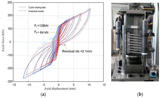 A cyclic loading test was conducted to acquire the hysteresis data of the SC-DSD, which was then compared to the results obtained from the analytical macro-model. As can be observed in Figure 4a, the hysteresis depicts the flag-shaped hysteresis. The maximum bearing force of the specimen obtained at 10.9 mm was 264 kN in both tension and compression. During the loading cycle, the damper activated at 64 kN, which was the prestress force on the disc springs, and the slit dampers started to yield at 128 kN. The loading protocol selected for the test is FEMA 461 []. The residual deformation was reduced to 0.5 mm for the first 10 cycles. However, due to external frictional forces, it went to 2.6 mm for larger displacement. The analytical model is able to predict the behavior of the damper accurately. The hysteretic curve obtained from the analytical model is superimposed on the experimental results. It shows the agreeable prediction for the calculation of bearing capacity, energy dissipation capacity, and residual deformation. The frictional forces between the inner and outer sections are ignored in the analytical model. Figure 4b shows the deformed steel strips during the experiment. Further details about the prototype and the experiments are discussed elsewhere [].