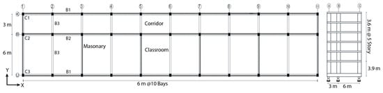 In this section, we undertake structural modeling to assess the efficacy of the SC-DSD as a retrofitting method for a Reinforced Concrete (RC) structure. Our focus is on a specific case study of an archetype school building constructed in the 1980s without seismic design considerations. Situated in the high-seismic zone of Los Angeles, California, this building comprises a six-story RC structure utilizing an ordinary moment frame system. The initial story stands at a height of 3900 mm, while the subsequent five stories measure 3600 mm in height each. There are two bays in the y-direction for classrooms and corridors, while in the longitudinal (x-direction), there are 10 bays with a length of 6000 mm. The plan layout of the structure is shown in Figure 5, and the details of the sectional properties and reinforcement bars used in the beams and columns of structures are mentioned in Table 2 and Table 3, respectively.