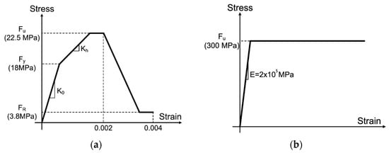 The concrete exhibits a nominal compressive strength of 18 MPa, with an ultimate compressive strength of 22.5 MPa and an ultimate strain of 0.002. The residual strength of the concrete is defined as 20% of its nominal compressive strength, as depicted in Figure 6a. Meanwhile, the steel reinforcement bar has a yield strength of 300 MPa, depicted by a bilinear curve in Figure 6b.