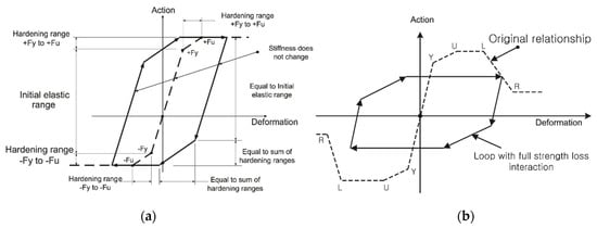 The beam element consists of inelastic end rotation moment hinges connected with the elastic segment; the relationship of the moment hinge is defined according to the ASCE/SEI 41-13 [], as shown in Figure 7a. According to ASCE/SEI 41-13, it is suggested to decrease both the flexural and shear stiffness of the beam to 50% and 40%, respectively, from their original values. Similarly, the flexural stiffness of the columns is modified to half of their initial values, considering the axial loads they resist. The cyclic performance of the analyzed columns is depicted in Figure 7b. Masonry infill walls are not considered in the analysis to save the computational cost. Further details about the nonlinear modeling of RC structures can be found in the user manual of Perform 3D software [].