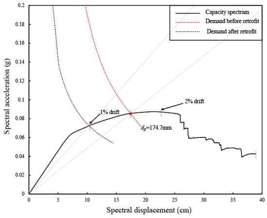 To evaluate the capacity of the original RC frame structure, the nonlinear static pushover analyses are employed, applying lateral loads in proportion to the fundamental modal shape until the maximum inter-story drift reaches 4% of the height of each story. Figure 8 illustrates the pushover curve, representing the nonlinear relationship between force and displacement along the longitudinal axis of the modeled structure. Transforming this pushover curve yields the capacity spectrum. Meanwhile, the demand curve is derived from the design response spectrum specific to Los Angeles, California. The performance point dp is calculated at the intersection point of the reduced demand spectrum using and capacity spectrum curves. The structure’s dp prior to seismically retrofitting with dampers is located at a spectral displacement of Sd 174.8 mm for the Design Basis Earthquake (DBE) hazard level. Additionally, the roof displacement of the structure is measured at 387 mm, indicating a maximum inter-story drift ratio of approximately 1.76%, estimated through the analysis of the mode shape vector. The seismic performance capacity of the original structure is not sufficient to meet the life safety limit state of 1% drift ratio at the (DBE) hazard level. The new performance point is obtained iteratively by modifying the demand curve until convergence. The effective period of the original bare frame structure in the longitudinal direction is calculated to be 3.2 s using the formula shown in Equation (4):