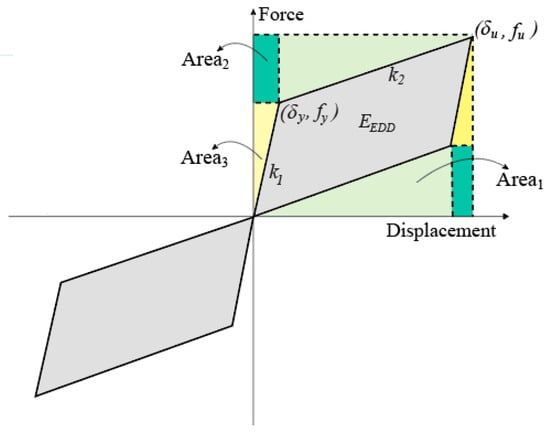 where denotes the energy dissipated per cycle of a damper, corresponding to the area enclosed by the idealized hysteresis curve depicted in Figure 9; H1 is the story height; θ is the lateral drift angle; and is the angle of connecting brace with the beam. The expression within the parentheses in Equation (9) [] represents half of the total area enclosed by the hysteresis curve and can be reformulated as shown in Equation (12):