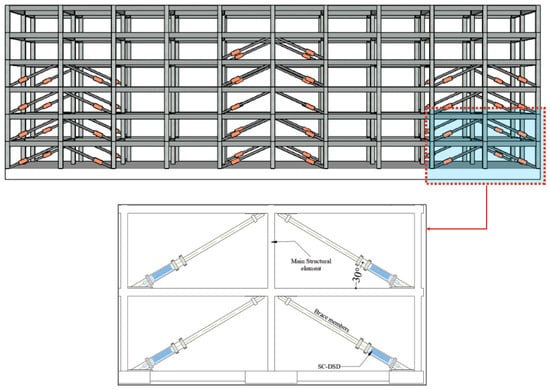 The number of SC-DSDs is approximated using the above procedure, which provides the required damping to satisfy the target inter-story drift ratio of 1%. It is estimated that a total of 52 dampers can provide sufficient dissipation and restore force to the structure under DBE-level shaking. In order to keep the symmetry when placing the dampers in the structure, 26 dampers are installed on each exterior frame. The retrofitting schemes are applied in the longitudinal direction in the exterior frames of the model structure, as shown in Figure 10, with dampers installed at the two lower corners of two consecutive bays. However, it is important to mention that as there are simplifications in the above process, the required damping obtained is not of optimum value but on the conservative side. The seismic performance of the model RC structure before and after retrofitting with the proposed SC-DSD and conventional SC is evaluated and discussed in detail in the next section.