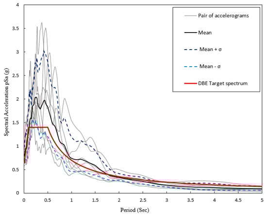 The model structure is assumed to be located in the high seismic zone of Los Angeles (34° N, 118.2° W), California. The spectral acceleration at short period is and the spectral response acceleration at 1.0 s is , for the DBE response spectrum, as mentioned in ASCE 7-22 []. The selected ground motion records used for nonlinear time history analysis are scaled for the DE level of the site-specific response spectra, as presented in Figure 11. They were scaled according to the ASCE guidelines, ensuring that within the period range of to , where represents the fundamental period. The average SRSS (Square Root of the Sum of the Squares) spectra across all ground motion records remained above 90% of the target response spectrum. The details of seven selected ground acceleration records provided by the PEER NGA database [], such as their peak ground acceleration (PGA), depth, and average shear velocity, are summarized in Table 4.