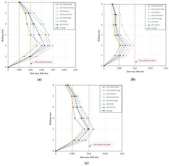 The maximum inter-story drift ratios (MIDR) observed in the original structure prior to implementing the proposed retrofitting schemes are shown in Figure 12a, and it is seen that the second and third stories are more critical. The MIDR ranges between 1.16% and 2.0%, with a mean value of 1.66%. This finding aligns with the inter-story drift ratio of 1.76% derived from the nonlinear pushover analysis. The maximum target drift ratio of 1% is considered the life safety limit state for a hospital or a school building according to ATC 40 [], and the original structure exceeds the target limit state performance level.