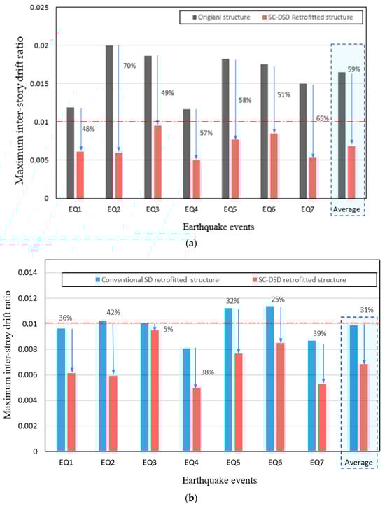 Comparison between maximum inter-story drift ratios of the original structure and the retrofitted structures. (a) Original structure and structure retrofitted with SC-DSD. (b) Structure retrofitted with SC-DSD and conventional retrofitted SD.