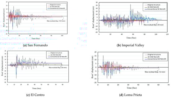 Comparison of maximum roof displacements of the bare structure, SC-DSD retrofitted structure, and conventional SD retrofitted structure.