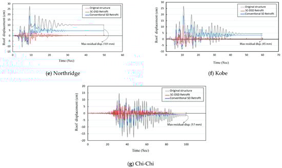 The maximum roof displacements obtained from the nonlinear time history analyses are compared in Figure 15. By comparing the seismic performance of the retrofitted structure to the original structure, the maximum roof displacement is reduced up to 62%, from 26.5 cm to 10 cm in the case of the Northridge ground motion. By retrofitting the original structure when excited under the DBE level shaking, the average maximum roof displacement is reduced up to 53% with the application of the SC-DSD, as depicted in Figure 15. Both retrofitting systems reduce the maximum roof displacement compared to the original structure under the selected ground motions. Moreover, the structure retrofitted with the SC-DSD shows an average maximum roof displacement of 31% less compared to the structure retrofitted with the conventional SD.