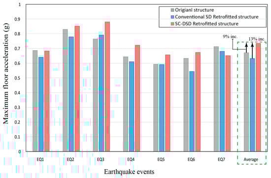 Maximum floor accelerations during excitation of the structure before and after the retrofit.
