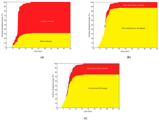 Seismic energy dissipated in structural components and dampers. (a) Original structure. (b) Structure retrofitted with SC-DSD. (c) Structure retrofitted with conventional SD.