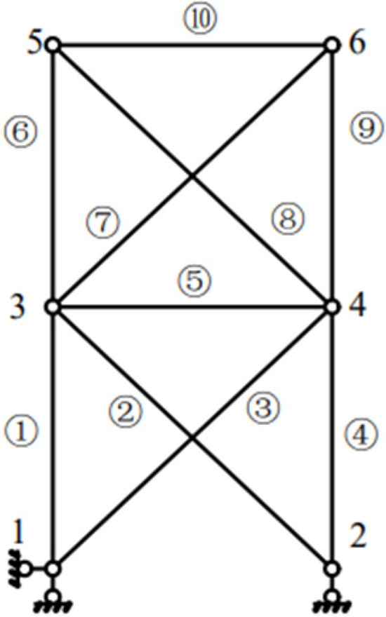 (1) In a grid structure, there is a certain constraint relationship between the connected components. This constraint relationship will generate a constraint level according to the distance between the topological relationship and the position of the support. For example, in the ten-bar truss structure in Figure 1, the support nodes (1, 2) play the role of supporting and constraining the entire superstructure, so the constraint level of the node at the support is the highest, and the components connected to the support nodes (①, ②, ③, ④) and the support nodes (1, 2) are mutually constrained. The relationship is a first-level constraint bar. The nodes (3, 4) are connected with the ends of the first-level constraint bars, which are regarded as the second-level constraint node. The member ⑤ between the nodes (3, 4) represents the second-level constraint bars. The members (⑥, ⑦, ⑧, ⑨) are connected with the second-level constraint nodes and away from the supports, which are the third-level constraint bars. The intersection points (5, 6) of the third-level constraint bars are the third-level constraint nodes, and the component ⑩ between the third-level constraint nodes is the third-level constraint bar.