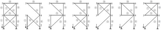 In order to prove that the above constraint level is higher than or equal to the constraint level of the analyzed component, an effective constraint conclusion must be generated. Through the verification of the ten-bar truss structure, for any component in the plane truss structure, it is only necessary to ensure that the two directions of x and y are completely constrained to achieve the effect of complete constraint. Therefore, for any node, as long as it is constrained by any two bars with different constraint directions, it can be guaranteed to be completely constrained. Taking the second-level constraint node 3 as an example, the node is connected with first-level constraint members (①, ②), a second-level constraint member ⑤, and third-level constraint members (⑥, ⑦). In order to verify the conclusion that the low-level constraint member cannot constrain the high-level constraint member, the five bars are removed one by one, and only two bars are retained each time to be connected to the second-level constraint node 3. The demolition results are shown in Figure 2.