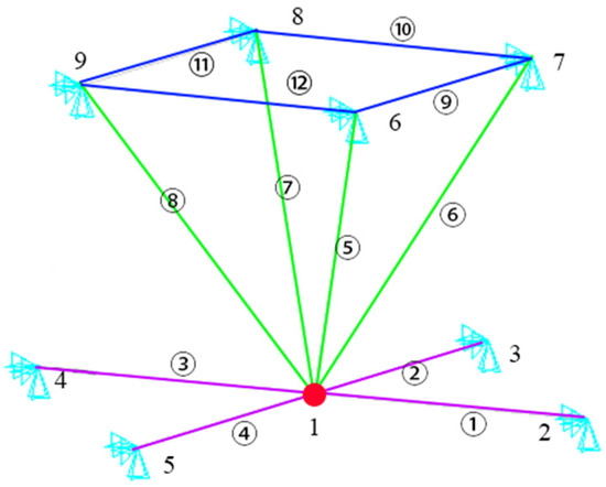 Taking the simplified model in Figure 3 as an example, the hierarchical combination analysis is carried out. In Figure 3, nodes 2, 3, 4, 5, 6, 7, 8, and 9 are fixed supports, and the structure is completely constrained. (1) The structure is divided into an upper chord layer (dark blue part), a middle web member layer (green part), and a lower chord layer (purple part). (2) A constraint analysis of node 1 (red node) is carried out. Because the upper chord layer does not directly constrain node 1, it is not necessary to consider the upper chord layer in the analysis, while the middle web member layer and the lower chord layer can completely constrain node 1 alone without the failure of the member. Therefore, when there are failed bars in both layers, node 1 may lack constraints, and it is necessary to conduct a specific combination analysis according to the number and locations of failure bars.