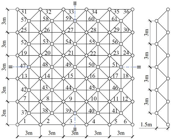 Because the load of the square pyramid grid is evenly distributed on the upper chord and the structure is symmetrical, the lower-left quarter of the whole structure is taken for series–parallel system analysis.