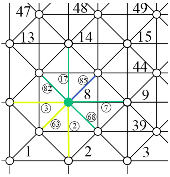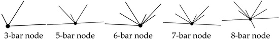 (2) The important nodes are judged according to the number of bars connected to each node and their position in the structure. All eight-bar nodes with the largest number of connecting bars and at the non-boundary positions of the structure are regarded as important nodes, and these important nodes are selected (their node numbers are 8, 9, 14, 15, 43, 44, 48, and 49). Figure 6 shows a schematic diagram of five kinds of nodes with different numbers of connecting bars in the grid.