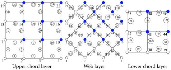 (1) In order to simplify the analysis of the constraints of important nodes, the structure is divided into an upper chord layer, a middle web layer, and a lower chord layer.