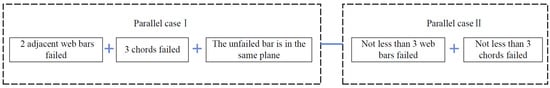 In the process of identifying the failure path via the -unzipping method, when the bar condition contained in the identification path is the same as any series part of the series–parallel system in Figure 9, it can be determined that the structure is damaged, the path identification is over, and the failure path is formed.