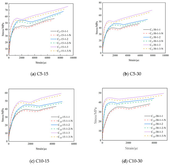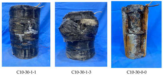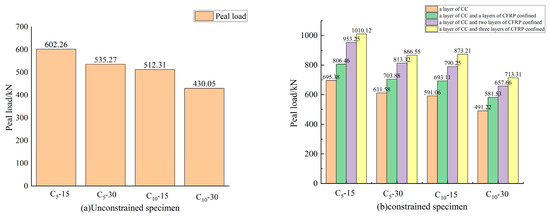- From the damage forms of the specimens, the unconfined reinforced concrete columns showed brittle damage with no obvious signs of damage. The bearing capacity of the reinforced concrete columns reinforced by single-layer CC was improved, but the increased bearing capacity was low. At the same time, the specimens showed ductile damage at the time of damage, and when the reinforced concrete columns with both CC and CFRP constrained together were damaged, the damage process of the CFRPs was slower and the specimens exhibited ductility. As the number of CFRP layers increases, the damage process of CFRP becomes slower and slower, the sound of damage becomes louder, the energy released by the damage is larger, and the concrete in the core area is completely crushed.