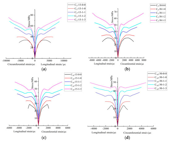 - The stress–strain curves of the concrete columns reinforced by CC and CFRPs and normal concrete columns both have rising and falling parts. However, the curves of concrete columns restrained by CC and CFRPs together show a pattern of first rise, then a small decrease and then rise. In this paper, an axial compression principal model applicable to the corroded reinforced concrete columns with CC and CFRPs jointly restrained is developed, which has high accuracy and can better describe the axial compression mechanical properties of corroded reinforced concrete columns.