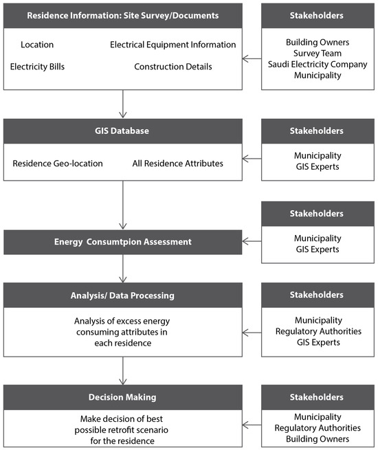 Saudi Arabia is a country with a predominantly hot climate, and reducing energy demand in residential buildings by energy retrofitting has been proven to be effective in several previous studies [15,16,17,18,19]. For example, in their study, Krarti and Howarth identified that modifying the current inventory of outdated window units and split systems in Saudi residential buildings to meet energy efficiency standards is projected to result in a decrease in electricity usage of approximately 33 terawatt-hours per year and a reduction of 24 million tons in CO2 emissions for the country [20]. However, energy retrofitting residential buildings have many challenges and one of the main challenges is to determine the feasibility and extent of retrofitting required. To determine the extent of retrofitting required for a particular building, all the information of a residential building is required including building characteristics and energy performance of each building. Currently, all this information is present but scattered among different stakeholders, and thus it is a challenge to utilize this information to support the energy retrofitting process [21], which would arguably be most effective if carried out at a wider scale since neighborhood buildings often share similar physical characteristics. Due to its integrative capabilities and ability to combine numerous datasets in one simple-to-use model, the Geographic Information System (GIS) has become an essential tool in sustainability planning [22]. The benefit of GIS is bringing together all the information into one database to help overcome one of the main challenges regarding sustainability planning, which is the lack of unity between different stakeholders [23]. In the case of Saudi Arabian cities, the key stakeholders include the Municipality, the Contractor, and the Energy Provider, all of whom have their different purpose/focus. Nevertheless, a GIS database can collect four categories of building attributes from four different organizations into one GIS-enabled database including the following: