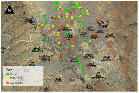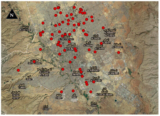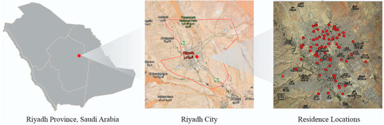 A door-to-door survey was conducted on all the 74 residences in Riyadh city and the data for each residence were recorded. The recorded data were then used to develop the GIS database. First, a base map was developed which displays the location of each residence on a map of Riyadh city. A default map in ArcMap was used as a base map of Riyadh city. Then, all the recorded attributes from the survey are inputted into the database (Figure 3).