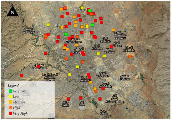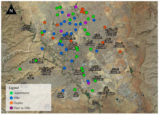 Hence, Riyadh city, due to its unsustainable residential sector, presents an ideal case study to test the developed GIS model. Seventy-four residences were selected in various neighborhoods across Riyadh and information needed in the database was collected via a survey as described in the next section. Among the 74 residences, there were a total of 25 villas, 13 duplexes, 5 floor in villas, and 31 apartments. The selected residences represent the residential sector of Riyadh and all the residential building types in the city. The residences are all different with unique attributes which present an ideal case study for the developed model.