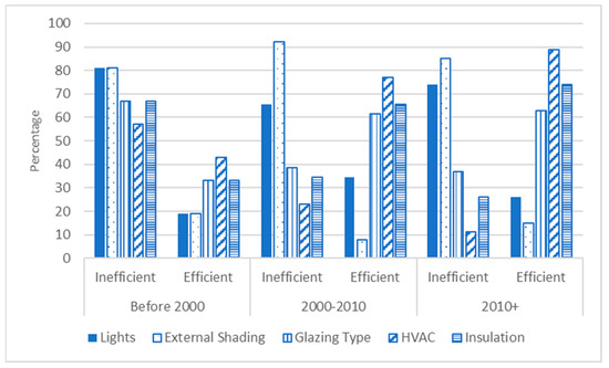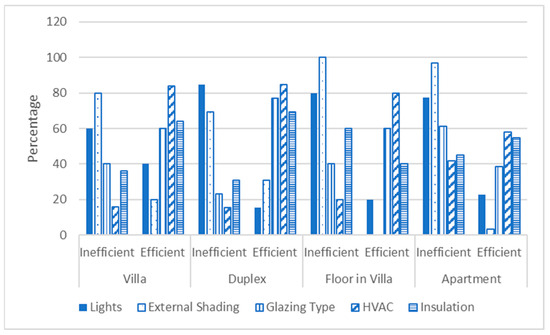 The latter two analysis methods are not as effective and detailed as the first one because bulks of buildings are being analyzed at the same time and retrofitting recommendations are based on the majority of percentages. For example, 40% of the villas have an undesired glazing type as shown in Figure 7; however, it is not recommended to retrofit the windows in the case studies from single glazing to double glazing as 60% have a desired window type. However, this means that 40% of the villas will continue to consume high amounts of electricity due to the undesired window types. The case is similar for other attributes in the two latter analysis methods. The three types of analysis are all applicable and support decision-making for retrofitting existing residential buildings in Riyadh. The decision to select the type of analysis depends on the policy makers; however, it is recommended to analyze each resident individually.
