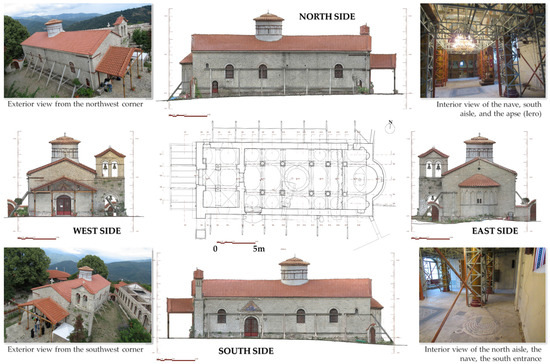 The new church followed the same foundation plans, visible at that time after the aforementioned destruction, although the architectural analysis [56] suggests that only the interior width (7.70 m) of the original church was retained. The rebuilt apse of the basilica may have shifted eastwards as compared to its original location at the first building, increasing the total length accordingly. These features present an appealing case study, since the current Katholikon (Figure 1) includes parts dating to the 13th century (exo-narthex), an interface of these parts with the newer 19th century structure, a nave that contains parts of a foregone modification (12th century eso-narthex), and a rebuilt apse that potentially does not coincide with the configuration and location of the original one.