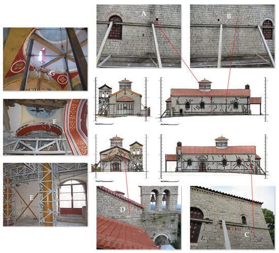 As mentioned above, the Katholikon has sustained extensive structural damage due to recent earthquakes, as evidenced macroscopically by exterior and interior cracks and failures. The pathology is described in detail in [58], whereas its non-destructive evaluation with ground-penetrating radar is presented in [60]. Figure 2 presents typical cracks and failures prior to the initiation of the restoration works. Figure 2A indicates an exterior structural crack observed on the north side of the Katholikon, which corresponds to the pair of structural cracks created by the northward thrust of the main dome during the earthquakes (mode along the N–S direction) as validated by the finite element modeling and assessment of the dynamic behavior of the Katholikon under simulated earthquakes [58,60]. Figure 2B indicates the crack located at the north side at the junction of the exo-narthex and the main church. Figure 2C indicates the cluster of structural cracks created at the east end of the south side of the Katholikon, as the result of the dynamic loading during the earthquakes along the E–W direction [58,60]. Figure 2D indicates a typical cluster of cracks created in the west side and the bell tower. Figure 2E indicates typical horizontal cracks observed at the interior of the main church (south aisle in this case), whereas Figure 2F,G indicate typical failures of the arches supporting the domes. Figure 2G, in particular, corresponds to the south arch supporting the main dome, and it is interesting to note that no pair of exterior structural cracks is observed in the corresponding positions on the south side of the Katholikon, as compared to Figure 2A. This indicates that the failure at the south arch relieved much of the earthquake loadings and did not influence the south wall accordingly, during the movement of the main dome along the N–S direction. In addition, many other cracks originate at the openings (doors and windows) of the Katholikon.