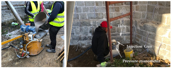 Based on the above, a commercial lime–metakaolin grout, MasterInject 222 from Master Builders Solutions, was used in the restoration of the Katholikon. It is a cement-free, lime–pozzolan (metakaolin) grout with a very fine particle size (<12 μm), high flowability, and excellent sustainment of its workability. The presence of the metakaolin—a highly reactive pozzolan—in the composition of both the restoration mortar and the grout material, ensures a fast consumption of the free calcium hydroxide of the lime, while, in parallel, allows for an early attainment of the grout’s mechanical strength [40,51]. The grout expands in the plastic phase; thus, it can fill even the smallest voids within the reinforced structure. Furthermore, it does not release water-soluble salts, it does not induce the development of efflorescence, and it presents excellent resistance to sulphates. This is important, because the results of the diagnostic study revealed the presence of soluble salts (>3% TSS) at the highly porous stones of the upper structure (arches), as well as at the mortar samples at the floor levels, where the presence of Cl− and SO4−2 is favored due to rising damp. The selected commercial grout develops a compressive strength >10 MPa and may therefore be classified as an M10 type according to EN 998-2:2016. The dry grout was added to the appropriate amount of water, according to the manufacturer’s directions (1 kg dry grout plus 0.3 kg of water) and mixed in the grouting vessel (Figure 3).