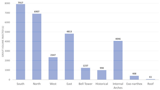 Worth noting is the large amount of grout injected in sub-area NE. However, this specific sub-area is the largest sized and contains some structural cracks that are attributed to the thrust of the dome towards the north direction (during earthquake—see discussion in previous section) and the presence of a transverse wall (initially the west façade of the original church) and the corresponding cracks on the north masonry [58,60].