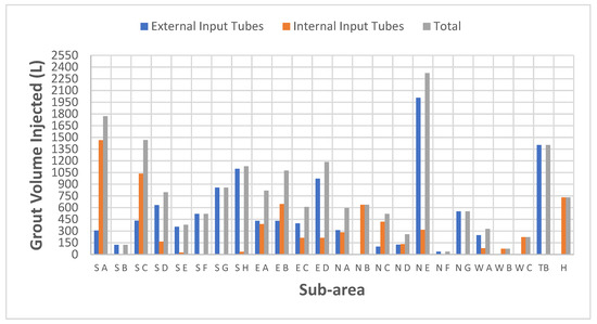 3.1.1. Analysis of Grouting Data per Area and Sub-Area