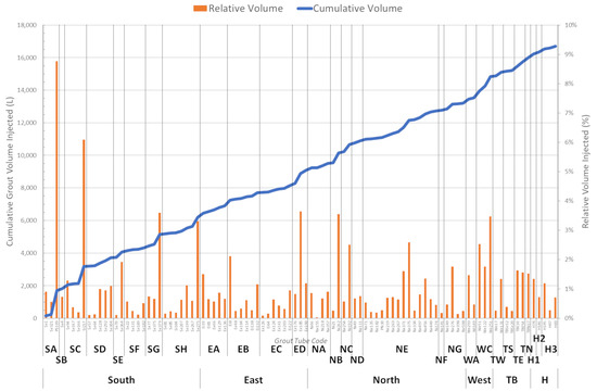 Although Figure 6 and the above discussion provide some insight regarding the interconnectivity between sub-areas, it is more prudent to examine the grout volume injected per tube. Figure 7 depicts the cumulative volume of injected grout and the relative volume of grout injected in each tube, throughout the timeline of grout injection for each sub-area. The sub-area codes are shown in Figure 4.