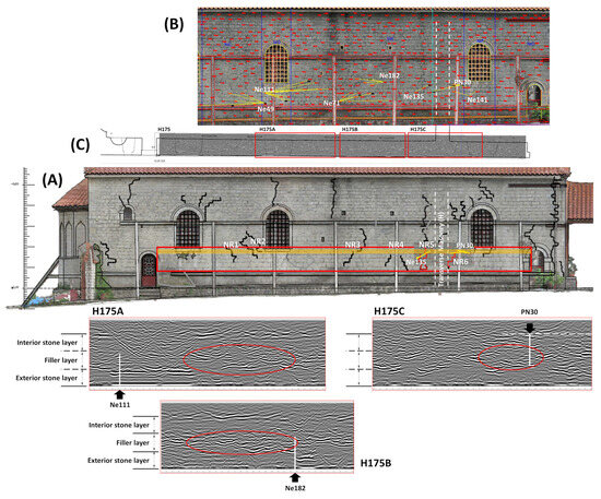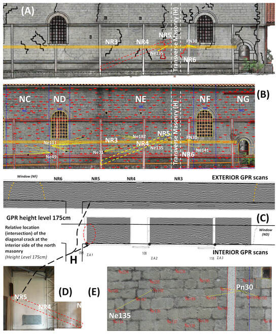 Figure 10 shows the position of these two tubes in relation to the aforementioned junction of the masonries, the observed exterior pathology, and the macroscopic large diagonal crack at the interior. GPR analysis [58,60] (Figure 10E) has indicated that an interior large diagonal macroscopic crack is not extending to the exterior through the three layers of the masonry (interior stone layer; filler layer; exterior stone layer), neither through the junction towards the north part of the exo-narthex. These findings are supported by the pattern of these two tubes.