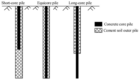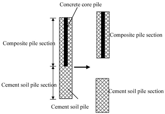 Short-core SDCM piles are more widely applied in actual projects. As shown in Figure 2, a short-core SDCM pile can be divided into a composite pile section and a DCM pile section. In this study, the composite pile section was regarded as monolithic with a composite modulus of elasticity of [15] calculated by Equation (2).