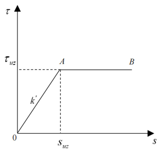 An ideal elastoplastic model was adopted for the transfer function of the pile side load at the pile–soil interaction interface, as presented in Figure 3 and Equation (4).