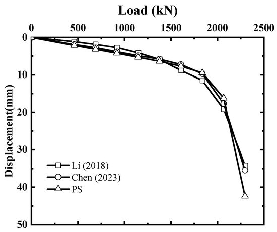 Li [38] conducted a full-scale field static load test on an equal-core SDCM pile. The diameter and length of the composite pile were 600 mm and 14 m, respectively. The core pile was a concrete-cored equal-section square pile with a section size of 270 × 270 mm. The moduli of elasticity of the core pile and outer DCM pile were Ep = 4.2 × 104 MPa and Ec = 150 MPa, respectively. As for the above field static load test [38], Chen et al. [16] utilized the results of multiple sets of tests on the DCM pile–soil friction characteristics using Wang [39] as the reference to determine the load transfer parameters at the DCM pile–soil interface. The initial tangent stiffness of the pile side and the pile end were and , respectively. The ultimate friction resistance values of the pile side and pile end were 65 kPa and 285.71 kPa, respectively. The composite modulus of elasticity of this SDCM pile was determined to be Ecm = 10945.7 MPa using Equation (2). The proposed simplified method was tested on the above data from the literature. The corresponding results were compared to Li’s test results [38] and Chen et al.’s calculation results [16]. The findings are summarized in Figure 5. The results obtained through the simplified method proposed herein are consistent with the test results.