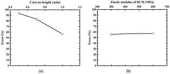 Figure 11a shows the variation of the relative error of the axial force at the pile end with the core-to-length ratio calculated by the simplified method and the proposed three-dimensional finite element simulation (the core content is 0.16 under working load, while other working conditions can be found in Figure 9 and Figure 10). According to Figure 11a, the error relative to the finite element model will decrease with an increase in the core-to-length ratio. However, when the core-to-length ratio is 1 (i.e., an equal-core pile), the error is still higher than 50%. It can be concluded that the change in the core-to-length ratio cannot reduce the error.